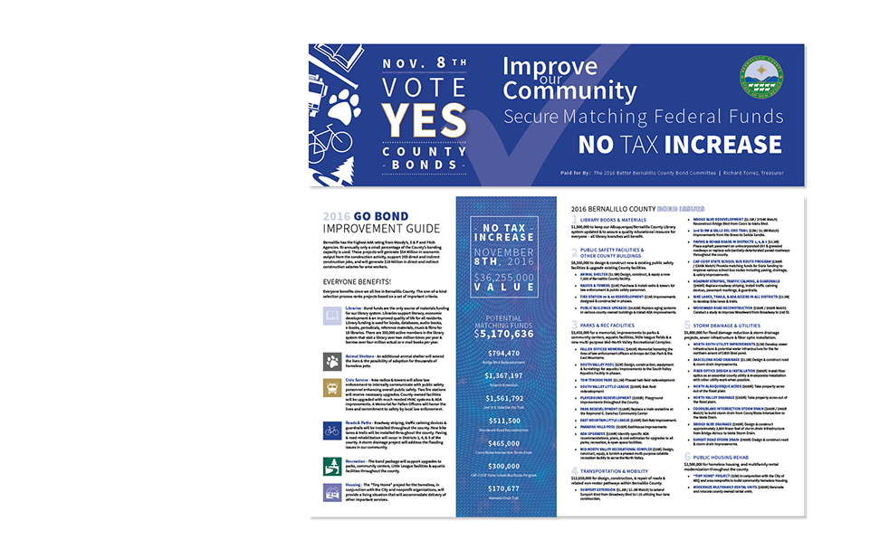 Billboard design and foldout informational piece for Bernalillo County GO BOND election in 2016.